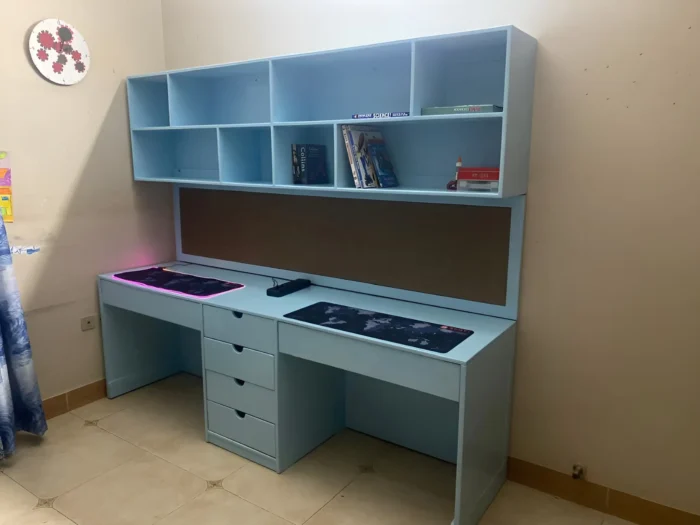 Designed for shared productivity and modern study needs, this all-in-one study table for 2 teens is a complete workspace solution for growing students. Made from premium MDF Lasani and finished with a smooth deco finish, it combines smart design with everyday durability. Ideal for siblings or shared rooms, this setup helps teens study together comfortably while keeping their personal space organized and clutter-free.