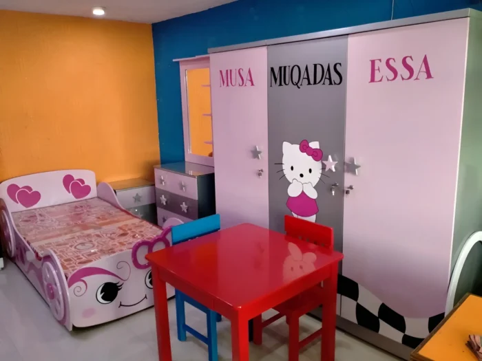 Designed for both beauty and practicality, this girls themed bedroom set is ideal for parents looking for a long-term solution that grows with their child. Smooth edges, balanced proportions, and playful detailing make it safe and visually appealing. Whether you’re furnishing a new home or upgrading your child’s room, this Kitty-themed set delivers comfort, storage, and style in one complete package—perfect for modern Pakistani homes.